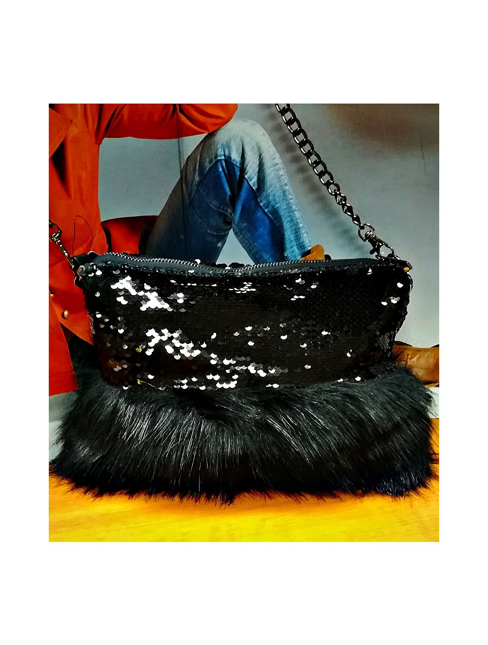 Műszőrméből készült alkalmi táska, flitterekkel díszítve.