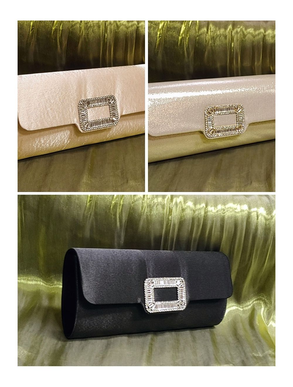 Dekoratív csattal díszített, szatén alkalmi táska.